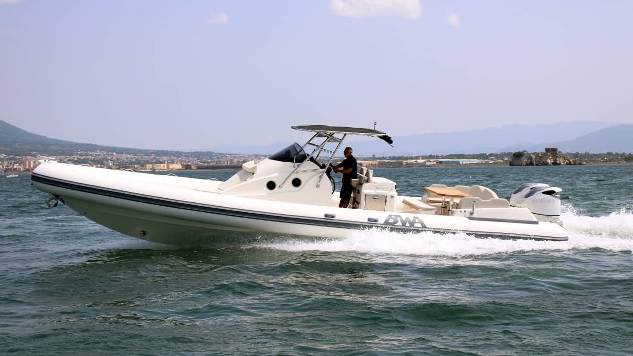 Motorisable de 2 × 250 à 2 × 450 CV (conseillé 2 × 350 CV), il dispose d’un réservoir carburant de 600 L. Le pont combine un solarium avant, une cuisine extérieure et un vaste espace repas arrière avec banquettes. Sous le pont, une cabine avant aménagée et une salle de bains séparée avec douche et WC marin apportent un confort rare pour un semi-rigide.